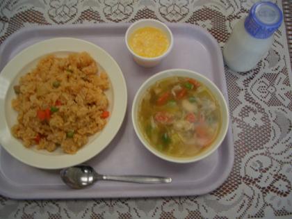 今日のメニューは、チキンライス、牛乳、白いんげんのいなか風スープ、ミルクゼリーです。