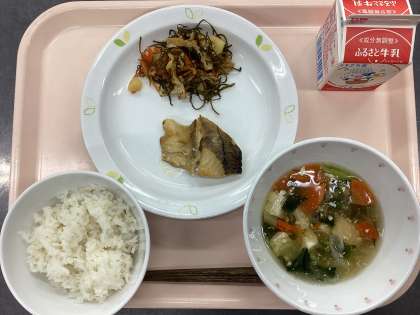 今日の給食は、麦ごはん、牛乳、魚の西京焼き、きざみこんぶの五目煮、吉野汁です。