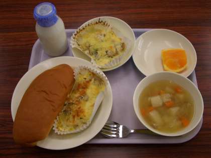 今日の給食は、ミルクパン、魚のマヨネーズ焼き、野菜スープ、くだもの、牛乳です。
