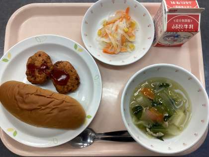 今日の給食は、黒砂糖パン、牛乳、豆腐のナゲット、大根サラダ、白いんげんの田舎風スープです。