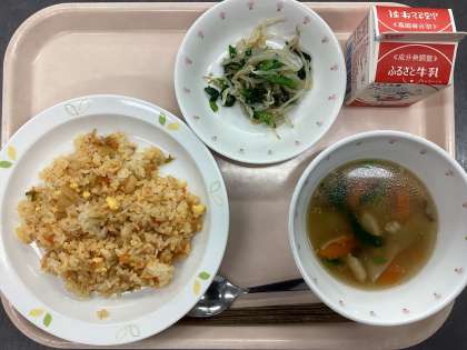 今日の給食は、キムチチャーハン、牛乳、ワンタンスープ、塩ナムルです。