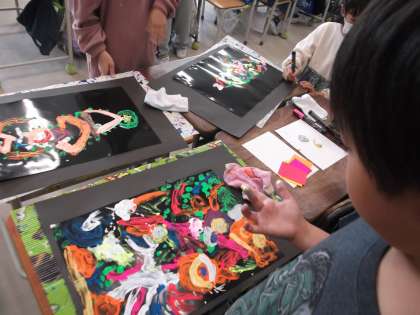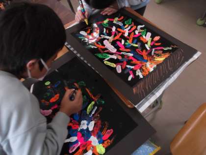 図画工作科の授業では、ポスターカラーを使って作品作りです。黒い紙に、カラフルな色が映えますね。とってもきれいです。