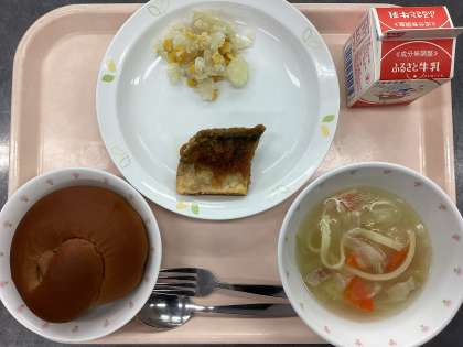 今日の給食は、ココアパン、牛乳、魚のステーキソース、コーンポテト、ヌードルスープです。