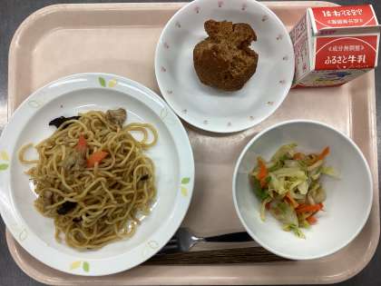 今日の給食は、塩焼きそば、牛乳、野菜の中華がけ、黒糖ごまドーナッツです。