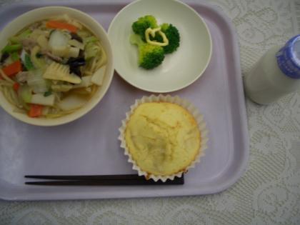 今日のメニューは、チャンポン、牛乳、リンゴマフィン、ブロッコリーのマヨネーズぞえです。