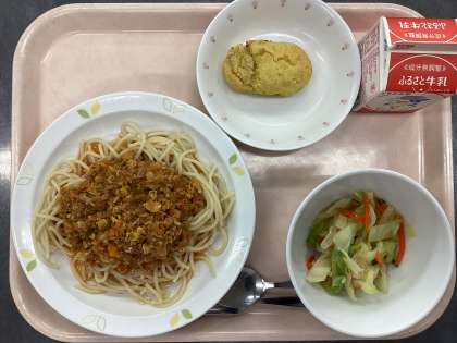 今日の給食は、スパゲティミートソース、牛乳、フレンチサラダ、スイートポテトです。
