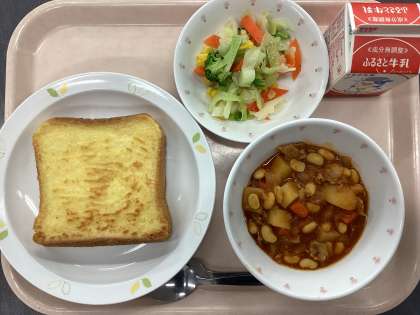今日の給食は、フレンチトースト、牛乳、ポークビーンズ、キャベツとコーンのサラダ