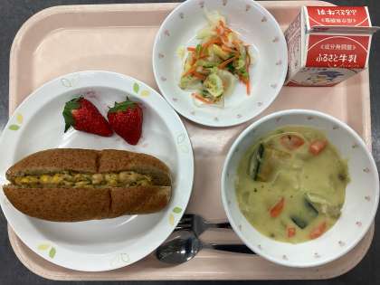 今日の給食は、ツナコーンサンド、牛乳、パンプキンシチュー、白菜のサラダ、くだもの(いちご)です。