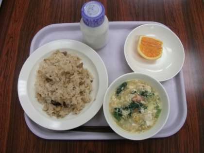 今日の給食は、中華おこわ 牛乳 中華風コーンスープ くだもの です。