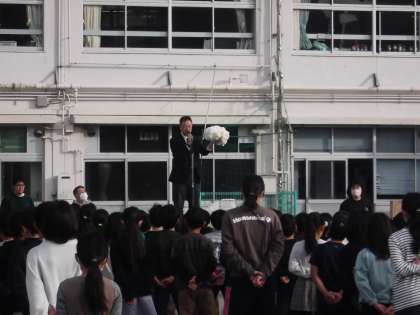 子どもたちも、校長室前の綿花の木を興味津々に観察していました。