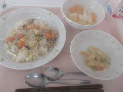 今日の給食は、あんかけチャーハン、牛乳、辣白菜(ラーパーツァイ)、杏仁豆腐です。