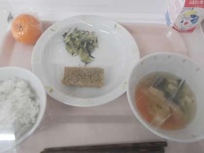 今日の給食は、麦ごはん、牛乳、松風焼き、野菜ののりあえ、吉野汁、くだもの(ぽんかん)です。