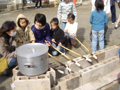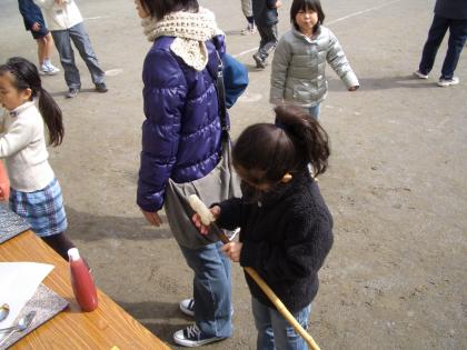 作った生地を今度は、竹の棒に巻いて・・・炭火のところで焼きます。竹をぬくと、空洞ができます。その空洞に、ゆでたソーセージや各種のジャムを入れて、おいしく頂きます。このイベントは、「九品仏小学校遊び場開放委員会」が主催する大きな行事の一つです。子どもたちにとって、とても人気のあるイベントです。このイベントには、学校もBOPも最大限の協力をしています。教職員の参加もあります。