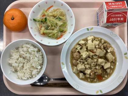 今日の給食は、麦ごはん、牛乳、豆腐の五目炒め、春雨サラダ、くだもの(みかん)です。