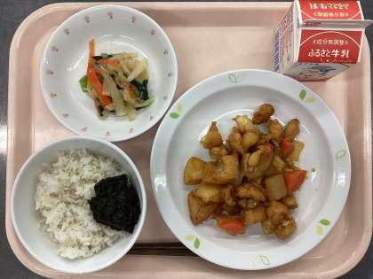 今日の給食は、麦ごはん、牛乳、のりの佃煮、鶏肉の変わりあえ、じゃこサラダです。