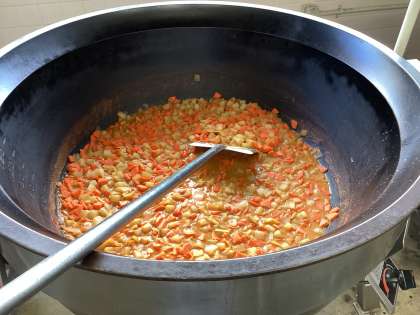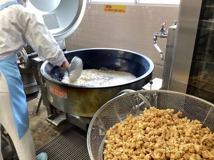 鶏肉の変わりあえは、下味をつけた鶏肉に片栗粉をまぶして揚げ、じゃがいもも素揚げしています。油で材料を炒め、水を加えて赤みそ、ケチャップ、酒で調味し、揚げた鶏肉、じゃがいもを加えて仕上げます。一手間加わった料理なので、たくさん食べてもらいたいです。