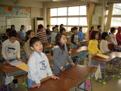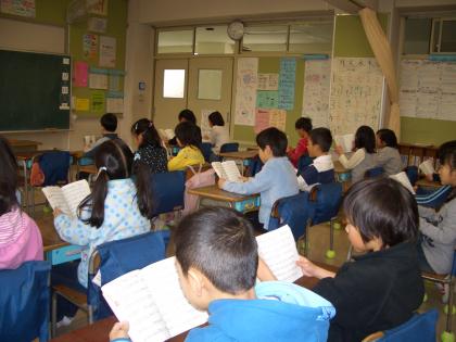 低学年の朝の様子をご覧ください。明日(3月4日・水)に「6年生を送る会」を行います。低学年では、「6年生を送る会」で歌う歌の練習をしていました。