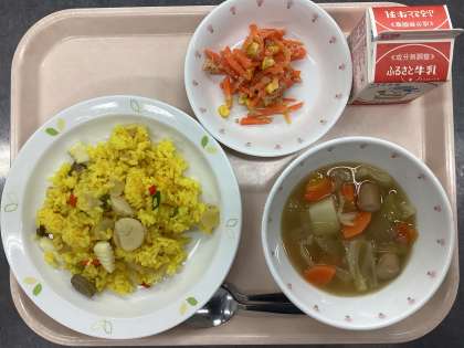 今日の給食は、パエリア、牛乳、コシード(スペイン風ポトフ)、にんじんサラダです。