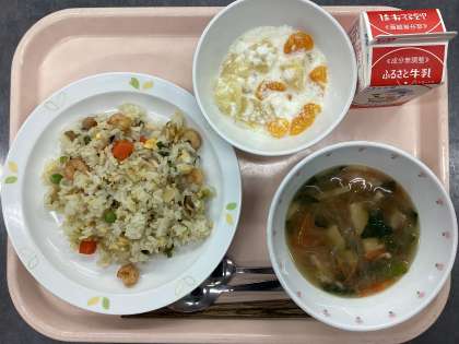 今日の給食は、えびチャーハン、牛乳、春雨スープ、フルーツヨーグルトです。