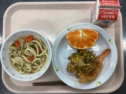 今日の給食は、ちゃんこうどん、牛乳、天ぷら(えび)、かきあげ、くだもの(甘平)です。