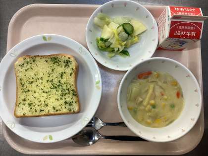 今日の給食は、ガーリックトースト、牛乳、コーンシチュー、りんごと白菜のサラダです。