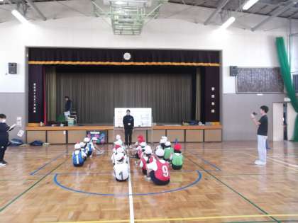 低学年分科会の提案で校内研究「ボール投げゲーム」を行いました。
