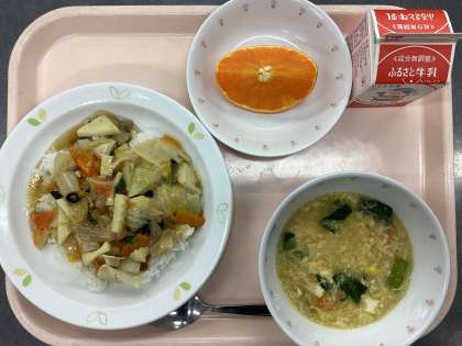 今日の給食は、中華丼、牛乳、中華風コーンスープ、くだもの(せとか)です。
