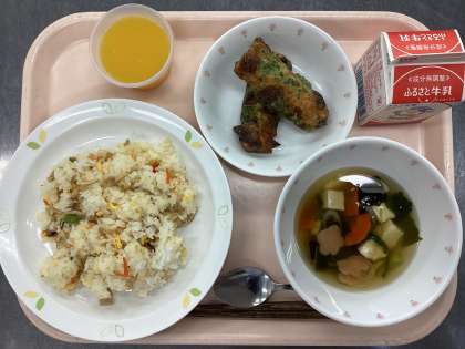 今日の給食は、ちらしずし、牛乳、ちくわの磯辺揚げ、すまし汁、もものゼリーです。