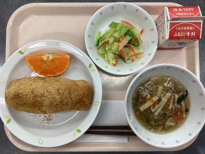 今日の給食は、きな粉揚げパン、牛乳、春雨スープ、アスパラガスのサラダ、くだもの(せとか)です。