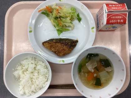 今日の給食は、ごはん、牛乳、魚のレモンソースがけ、キャベツサラダ、白菜のスープです。