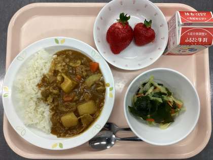今日の給食は、カレーライス、牛乳、キャベツとわかめのサラダ、くだもの(いちご)です。