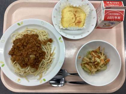 今日の給食は、スパゲティミートソース、牛乳、じゃがいものハニーサラダ、チーズケーキです。