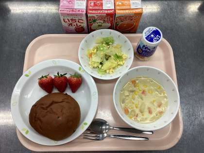 今日の給食は、チョコチップパン、セレクトドリンク、コーンクリームスープ、ミモザサラダ、くだもの(いちご)です。
