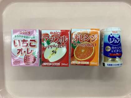 今日はセレクト給食で、飲み物のセレクトです。いちごオレ、ジョア、りんごジュース、オレンジジュースの4つの中から事前にセレクトしたものを飲みます。