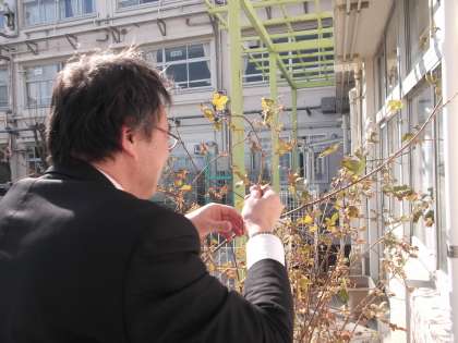 校長室前の花壇には、校長先生が1年間育てていた綿花があります。