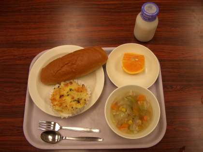 今日の給食は、黒ざとうパン 牛乳 野菜スープ ポテトのチーズ焼き くだもの です。