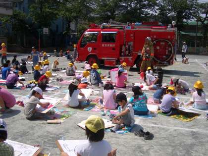 昨日、はたらく消防の写生会を行いました。1〜3年生の子どもたちが画用紙いっぱいに伸び伸びと消防車を描いていました。