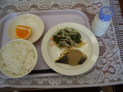 今日のメニューは、ごはん、魚のごまだれかけ、和風サラダ、くだものです。