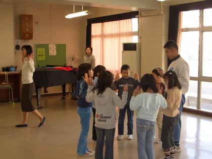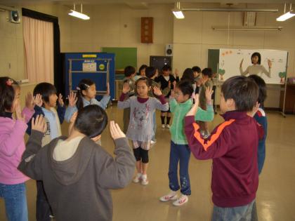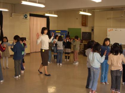 低学年がゲストティチャーを迎えて、“リトミック”の学習をしました。ゲストティチャーのピアノの音に合わせて体を動かしています。初めは緊張していましたが、やっていくうちにだんだんリズミカルに動くようになりました。