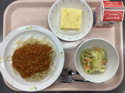 今日の給食は、スパゲティミートソース、牛乳、キャベツサラダ、パインケーキです。