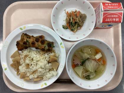 今日の給食は、たけのこごはん、牛乳、ちくわの磯辺揚げ、ごま酢がけ、豆腐汁です。