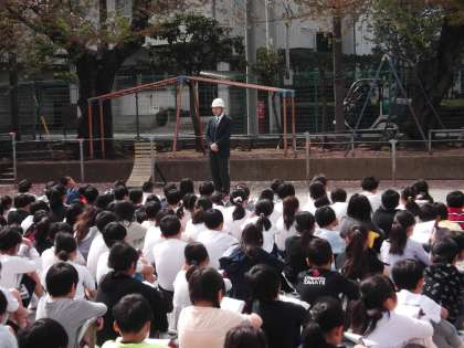 1年生は初めての避難訓練。先生の話をしっかりと聞きながら訓練を行いました。