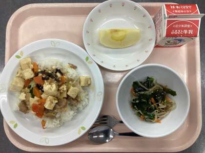 今日の給食は、家常豆腐丼、牛乳、中華風わかめサラダ、くだもの(りんご)です。