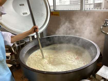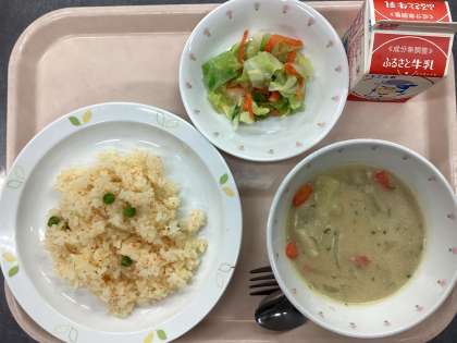 今日の給食は、キャロットライス、牛乳、シーフードシチュー、アスパラガスのサラダです。