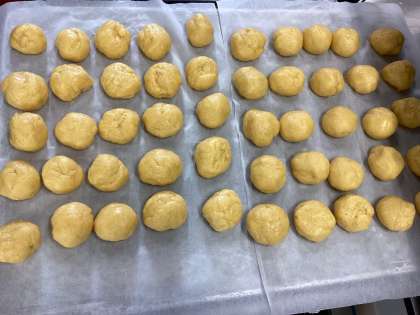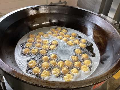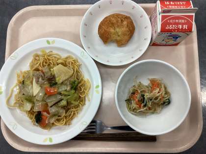 今日の給食は、五目あんかけそば、牛乳、塩ナムル、サーターアンダーギーです。