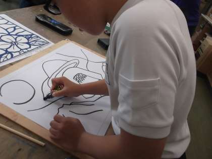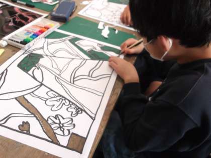 富士山を取り入れた下絵を描き、カッターで切り取りました。