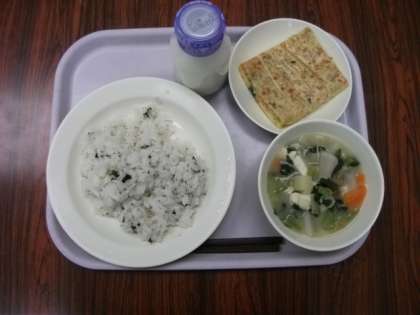 今日の給食は、ちりめんごはん 牛乳 千草焼き 田舎汁 です。