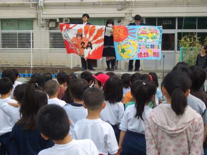 今日の朝会に八幡中学校生徒会から3名の役員が体育祭のアピールに来ました。全校児童に向かって話をする姿がとてもさわやかでした。八幡中学校の体育祭は、6月2日(土)です。みんなで応援に行きたいです。