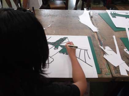 カッターナイフで下絵を切り取り、黒い紙にスポンジを使って絵具を塗っていきます。