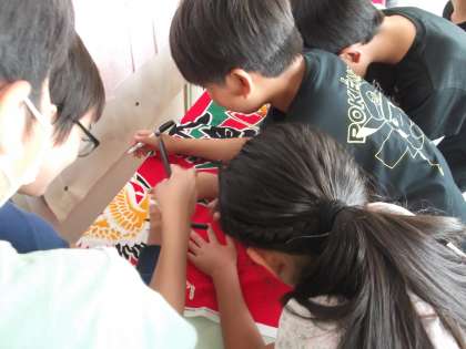 休み時間に、廊下の机の周りに多くの5年生の子どもたちが集まっていました。